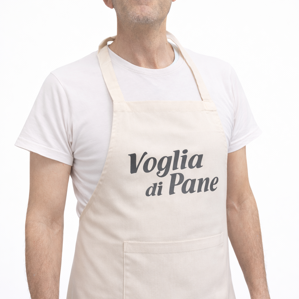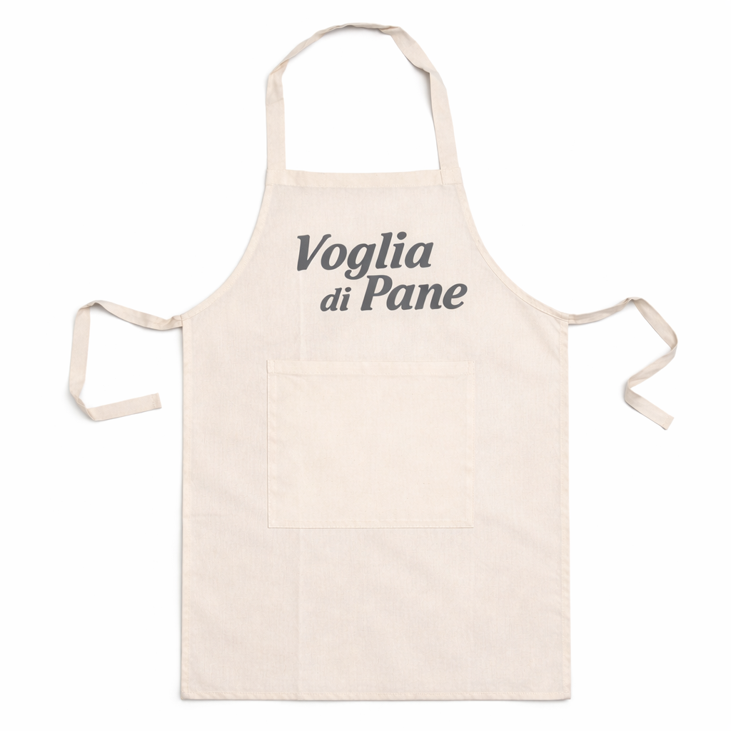 Grembiule in cotone naturale, resistente e pratico. Dotato di tasca frontale e laccetti regolabili, è pensato per l’uso quotidiano in cucina e in laboratorio. La stampa “Voglia di Pane” è discreta e pulita.